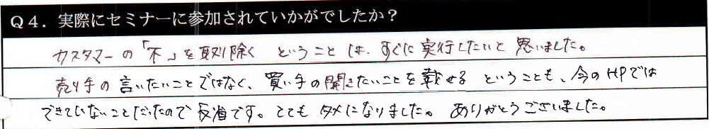 売り手の言いたいことではなく、買い手の聞きたいことを載せるということも、今のHPでは出来ていないことだったので反省です。とてもタメになりました。ありがとうございました。